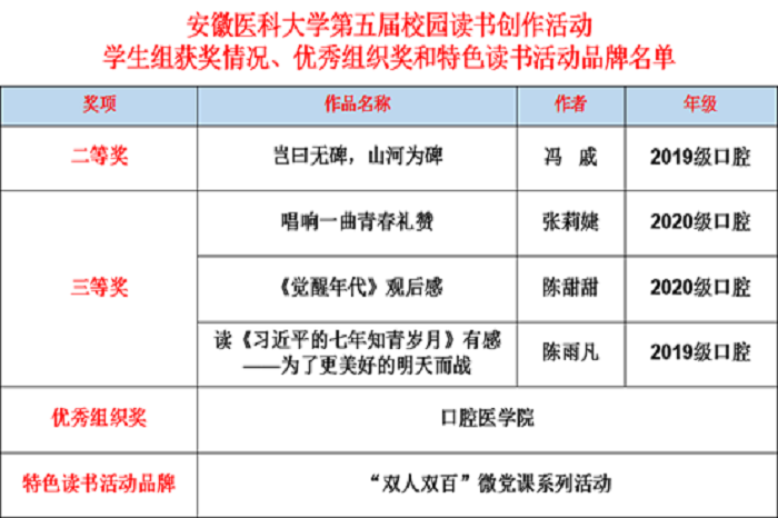 此次活动以“读书引领人生,创作点亮梦想”为宗旨,“致敬百年风华,勇担时代使命”为主题,全校人员积极参与,共征集作品 300 篇,设大学生组和教师组2个组别。经层层选拔、评审,最终,学生组中,91国产 冯戚同学的征文《岂曰无碑,山河为碑》荣获学生组二等奖,张莉婕同学的《唱响一曲青春礼赞》、陈甜甜的《<觉醒年代>观后感》、陈雨凡的《唱响一曲青春礼赞》分别荣获三等奖;教师组中,修复科党支部的征文《党的路程》荣获教师组二等奖,李素琴老师报送的《白求恩精神 历久弥新 永放光芒》获得三等奖,朱艳秋、孙雅慧老师的《以史为鉴,奋进前行》和《致敬百年风华  勇担时代使命》获得优秀奖,91国产 组织的“双人双百”微党课系列活动被评为“特色读书活动品牌”,学院(医院)荣获“优秀组织奖”。
