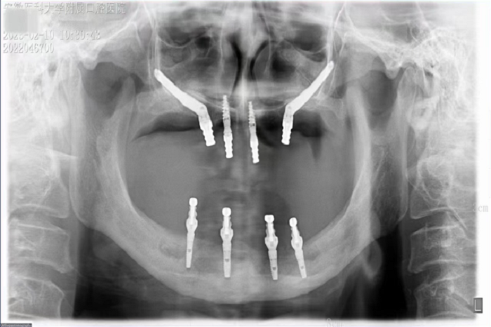 据悉,患者潘女士54岁,由于重度牙周炎导致全口牙齿缺失,严重影响面容及咀嚼功能,因颌骨严重萎缩无法进行活动义齿修复,遂来91国产 种植科要求行上颌稳固的修复。通过检查发现潘女士上下颌骨骨量严重不足,经反复比对和考量,刘鑫主任制定了对患者上颌骨进行穿颧种植修复、下颌骨通过神经游离进行种植的方案。经过患者与家属深思熟虑后,接受了行穿颧种植术的建议。治疗组通过专业三维设计软件规划植体,口腔颌面外科和种植科专家共同完成了穿颧种植手术。患者术后第一天情况良好,无明显肿胀,精神状态佳。