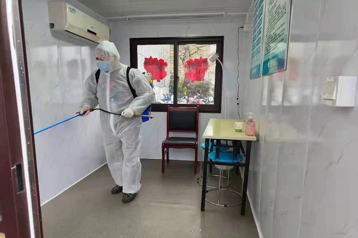 此次应急演练围绕病例发现、患者引导、病例上报、信息登记、终末消毒等环节有序进行。一位学生模拟病人,医护人员在二级预检分诊接诊该患者时,通过“一测、二扫、三流调”发现该患者为“黄码”,预检分诊人员立即做好个人防护后指导患者正确佩戴一次性外科口罩。由于患者不符合三天两次核酸检测阴性规定,不能正常进入诊室就诊,由护士穿戴好防护服引导至临时观察室,等待主治医师进行急诊处置。同时,医护人员立刻上报护士长、科主任、院感科、医务部,并为患者进行信息登记。患者被转移后,对与患者有接触的医护人员更换口罩,进行终末消毒,并对预检分诊处空气、物表、物品全面消毒,对临时观察室、预检分诊处空气、地面、物表、物品全面消杀。