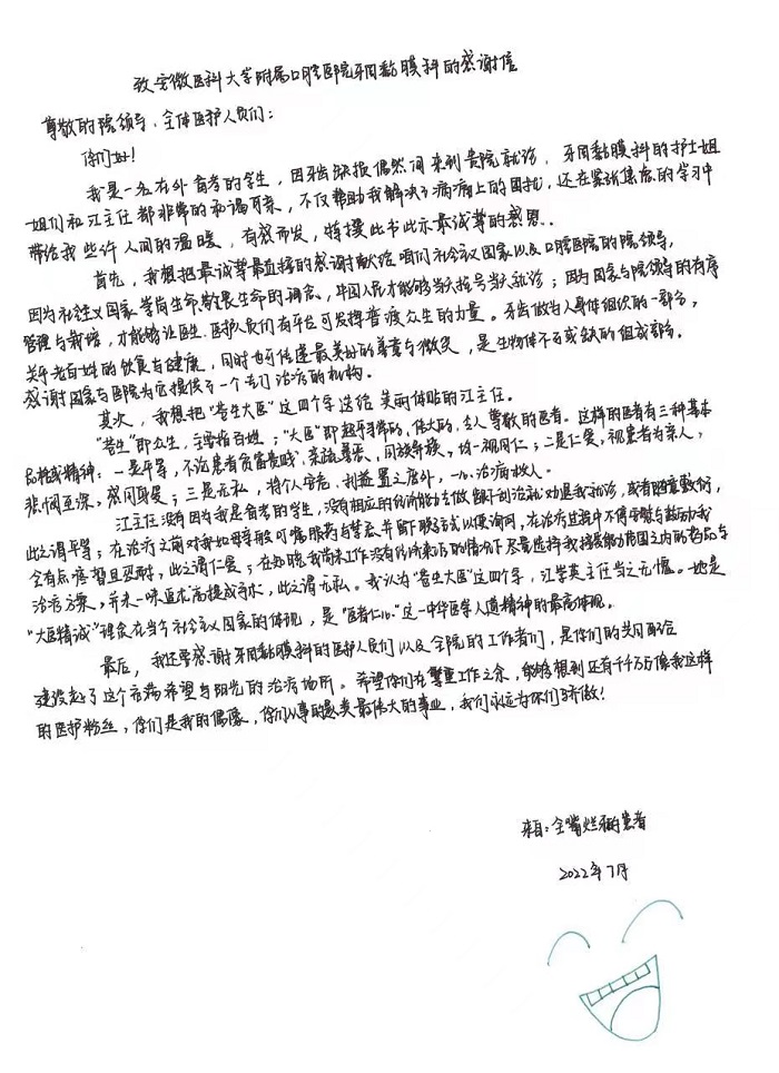 7月26日,91国产 二楼牙周黏膜科上演了温馨的一幕,一位自嘲全嘴烂牙的患者特地来院将印有“苍生大医 救我狗牙”的锦旗和一封饱含深情的感谢信送到牙周黏膜科江崇英主任的诊室,表达了对牙周黏膜科全体医护人员的高度肯定和赞扬。