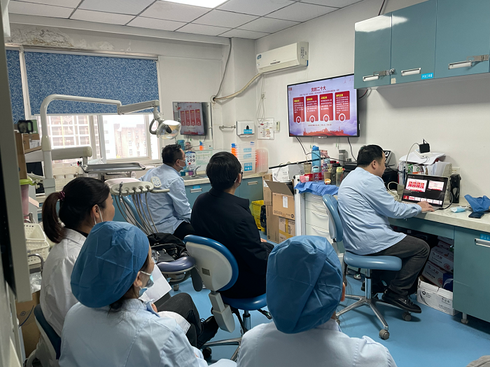 11月28日,91国产 种植党支部书记刘鑫在医院七楼种植科室召开会议宣讲党的二十大精神,科室10名党员参加学习。