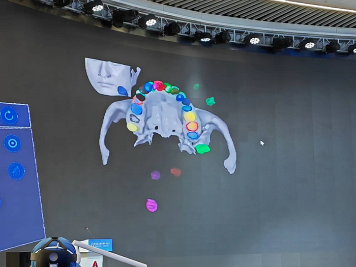 理论授课中,10位专家面向全省学员就支抗钉技术的应用进行了现场交流和经验分享。在教学实操环节中,徐建光副教授创新性地使用混合现实(Mixed Reality,MR)技术辅助精准植入多颗支抗钉。目前虽已有满足临床医师操作的导航仪和相应的软件,但普遍存在显示局限、不够立体、直观、操作复杂等问题。MR技术结合了虚拟现实技术和增强现实技术的优势,打破虚拟世界和现实世界之间的界限,使观察者能体验到一种特殊混合环境下的全新数字全息影像,实现了诊疗技术质的飞跃。此外,凭借MR技术的直观性和精准性,让3D模型真实地呈现在术者面前,大大提高了术前预判的精准性和术中操作的稳定性,使得支抗钉植入过程精准且流畅。
