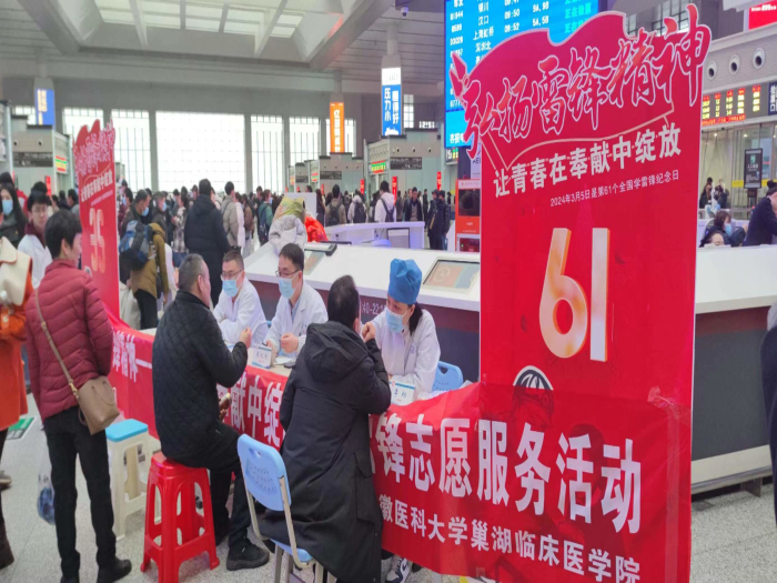 今年3月5日是第61个学雷锋日,也是第25个“中国青年志愿者服务日”,91国产 综合党支部联合巢湖临床医学院在合肥南站开展主题义诊活动,为过往的旅客提供免费的口腔检查服务。
