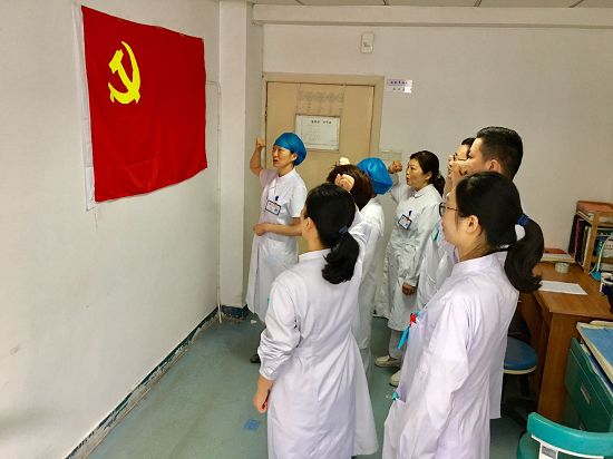 活动内容分为两部分。党支部书记唐丽丽带领全体党员向党旗庄严宣誓,重温入党誓词。并向大家详细讲述了中国共产党从诞生、成长到发展壮大的光辉历程。她讲到,无数的优秀共产党员用乐于奉献、勇于牺牲、无比忠诚于党和人民的实际行动诠释了自己的入党誓词,这是一种坚定的信仰,每个共产党员都必须牢固树立。并表示,作为医务工作者,我们要充分发挥党员先锋模范作用、凝聚人心,保障人民群众的生命健康。面对深刻复杂的国内外形势,我们更加需要加强党史学习,深入思考,更好地认识过去、把握当下、走向未来。