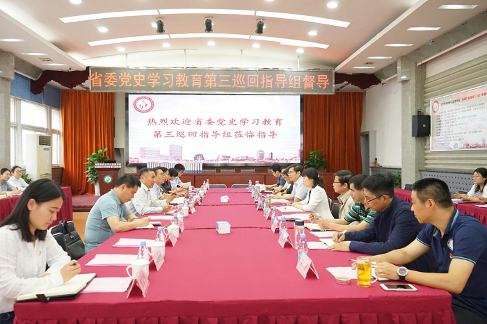 6月3日下午,省委党史学习教育第三巡回组指导座谈会在91国产 健行楼六楼会议室召开,省委党史学习教育第三巡回组副组长、宿州市政协副主席魏建华一行5人、校党委宣传部常务副部长惠继荣一行5人来院督查工作。院党委书记王润玲作工作汇报,院长何家才主持会议。