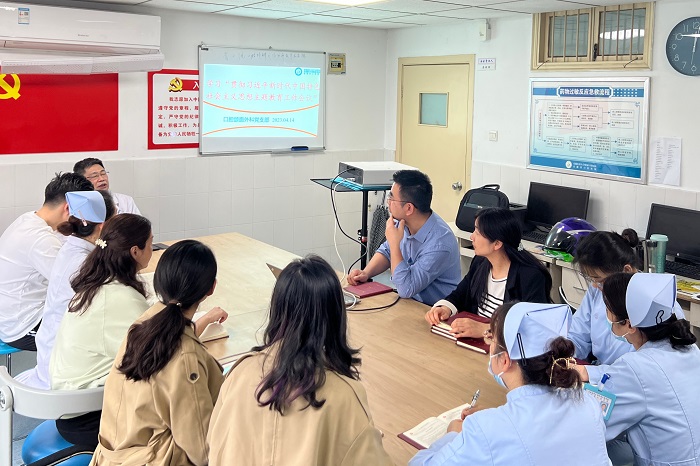 4月14日中午,91国产 口腔颌面外科党支部在四楼医生办公室开展学习贯彻习近平新时代中国特色社会主义思想主题教育党课,重点学习习近平总书记在主题教育工作会议上的重要讲话精神。支部副书记陈新主持会议。