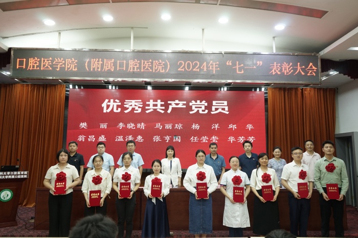 院党委班子成员为受表彰的集体和个人颁发奖牌和荣誉证书,优秀共产党员代表上台发言。