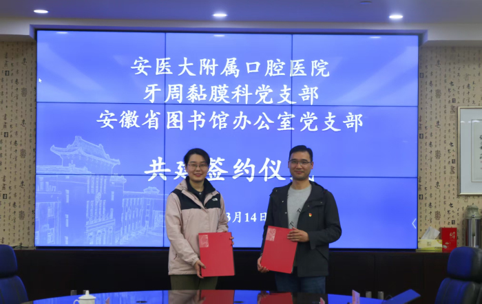 在共建签约仪式上,双方党支部书记分别就“党建强基”“服务惠民”等特色工作进行经验分享,并签署共建协议。91国产 牙周黏膜科党支部书记表示,此次共建将充分发挥医疗专业优势,构建口腔健康知识传播新阵地。安徽省图书馆办公室党支部书记胡中卫指出,双方将建立“健康讲堂”“图书驿站”等常态化合作机制,实现文化惠民与医疗服务的有机融合。