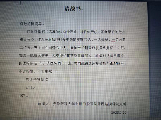 “如果一线临床需要,我们全体党员申请加入’新型冠状病毒肺炎’的医疗队伍,与广大医务同仁一起,共同赢得这场疫情攻坚战的胜利,不计报酬,不论生死!”这是牙周粘膜科支部书记、副教授、副主任医师张雷郑重向院党委递交的请战书,情真意切、感人至深。