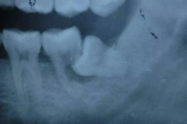 2、磨牙龋齿:对于向前倾斜的阻生智齿,食物通常积聚在相邻牙齿之间,这容易导致相邻牙齿(下第二磨牙)的龋齿。这种龋齿不容易被发现,一旦出现疼痛(急性牙髓炎),牙冠通常会严重受损。出现龋齿、牙髓炎,甚至牙齿不能保留。第二磨牙缺失对咀嚼功能有很大影响,也很难用义齿修复。