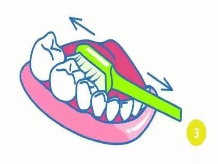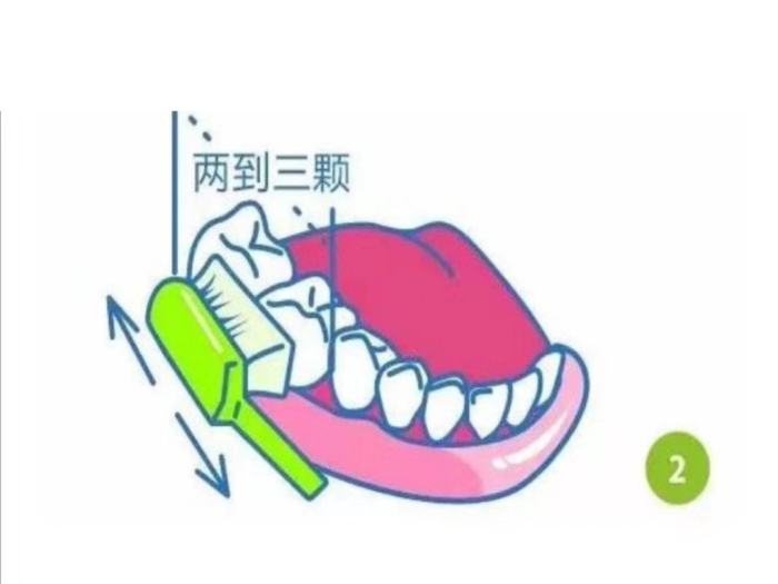 2.以2~3颗牙为一组,以短距离(约2mm)水平颤动牙刷4~6次,避免动作过大又变成横刷。