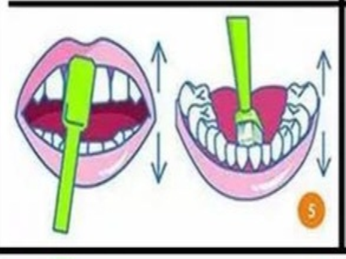 5.前牙内侧有些特殊,需要将刷头竖放在牙面上,使前部刷毛接触龈缘或进入龈沟,做上下提拉颤动,自上而下拂刷不做来回拂刷。刷下前牙舌面时,自下而上拂刷。