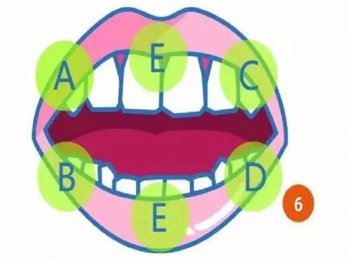 6.将牙齿分为6个区域,每个区域一个个进行,保证牙齿正面内侧面以及咬合面都刷到。