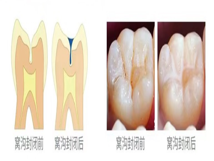 窝沟封闭前存在深的窝沟点隙,不易清洁,滞留食物、滋生细菌,最终发展成龋齿。窝沟封闭后封闭深的窝沟点隙,使窝沟底变成平面,容易被刷牙清洁,食物细菌不再滞留,可有效防蛀。