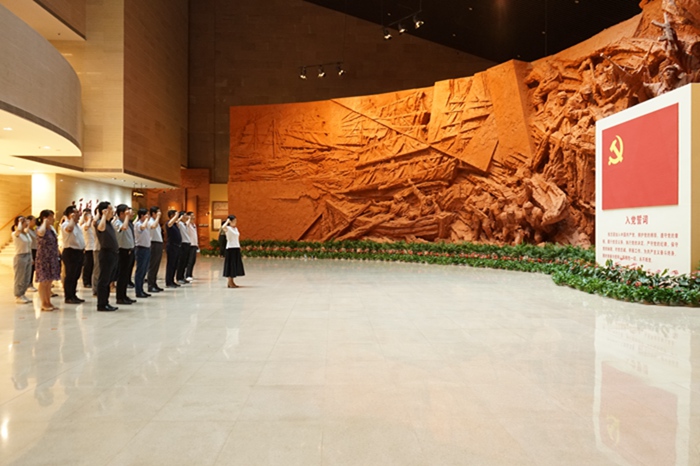 在渡江战役纪念馆,全体党员沿着习近平总书记考察时的足迹进行参观,重温了习近平总书记重要讲话指示精神。展馆大厅里,王润玲领誓,全体同志举起右拳庄严宣誓,党旗下铮铮誓词响彻场馆每个角落。随后,在讲解员的带领下,大家回顾了具有决定性历史意义的革命战争史,一张张照片、一件件文物是烽火岁月的历史见证,生动还原了“百万雄师过大江”的壮丽场景。“渡江战役的胜利是靠老百姓的小船划出来的。”视频中习近平总书记的讲话,让中心组成员深刻领会到伟大的渡江战役锻造出的坚定信念、革命到底、军民团结、奋勇争先的渡江精神,大家一致表示将传承渡江精神,赓续红色血脉,凝聚奋进力量,以优异成绩迎接党的二十大胜利召开。
