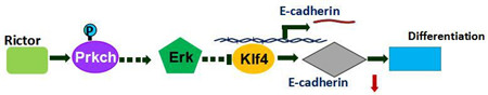 21世纪是生命再生医学的年代,干细胞研究起到了重大的推动作用。对于干细胞的研究,有助于阐明许多重大疾病的发病原因,在干细胞的研究中干细胞如何自我更新(Chambers and Smith, 2004)(也称为干性维持)以及如何调控其多种分化潜能是其热点和难点,91国产 朱友明课题组首先比较Rictor在MEF和R1-ES细胞中的表达,发现Rictor在R1细胞中表达显著低于MEF细胞,随后在R1这种无需饲养层的干细胞中敲低目的蛋白Rictor的表达水平,加入RA(1uM)处理或者不加RA处理,发现敲低Rictor后R1不分化,过表达Rictor会诱导干细胞R1分化,在IPS的诱导过程中Rictor表达水平下调,而在RA诱导R1分化过程中Rictor表达水平上调。以Rictor为靶蛋白通过免疫共沉淀验,并进行质谱分析发现Prkch与Rictor相互作用,同时发现过表达Prkch会诱导干细胞R1分化,进一步的研究发现Rictor通过促进Prkch642位丝氨酸磷酸化,而642位丝氨酸磷酸化的Prkch进一步影响Klf4295位丝氨酸磷酸化,从而导致Klf4转录活性的变化,抑制Klf4依赖E-cadherin的表达,随后导致ES细胞分化。该研究结果表明,Rictor-Prkch-Klf4通路在调节ES细胞分化中具有重要作用,为未来研究mTORC2对干细胞分化的影响具有一定的指导意义。