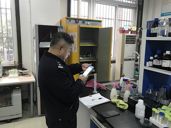 余警官详细查看了相关单位的化学品管理进出台账,危化品储存柜的存储情况,对消防设施是否完善、安全防护措施是否有效、是否落实双人双锁制度以及安全监控是否健全等情况进行重点检查。