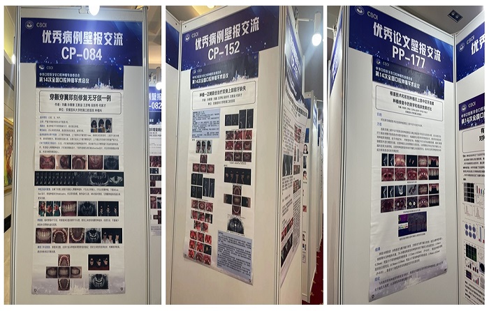 本次大会开设主题学术演讲、科普创作交流、优秀论文和优秀病例交流等模块。在优秀病例交流环节中,91国产 龙鲜艳同学以《Er:YAG激光辅助清创治疗右下颌前牙种植术后感染一例》为题进行了现场汇报,她立足学术理论、结合临床实际,以严密的逻辑思维和精彩的发言赢得了现场阵阵掌声。种植科刘鑫副教授及其团队相关病例《穿颧穿翼即科修复无牙颌一例》《根盾技术和即刻种植在上颌中切牙连续种植修复中的美学和临床效果对比》《种植—正畸联合治疗双侧上颌前牙缺失》也进行了壁报展示,为全国口腔行业同仁奉献了一场精彩的学术盛宴。