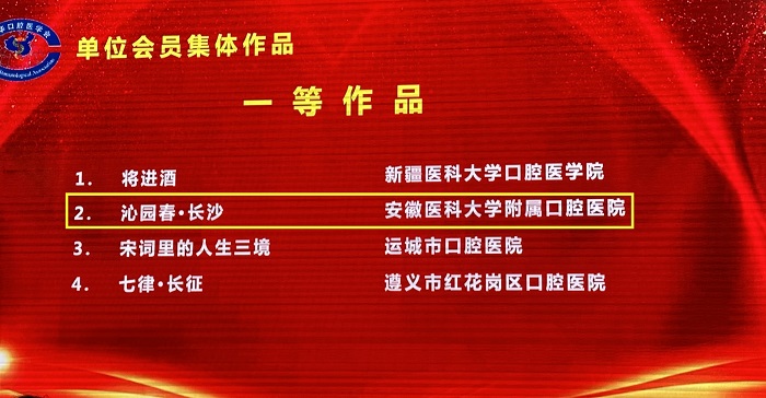 在“5·30中华口腔医学会会员日暨全国科技工作者日”会员诗词朗诵环节,由91国产 望湖城门诊部姚育智、教学管理办公室王烨、牙体牙髓科马腾飞和政务区门诊部孙晖4位老师朗诵的作品《沁园春·长沙》,以雄厚的实力荣获一等奖。
