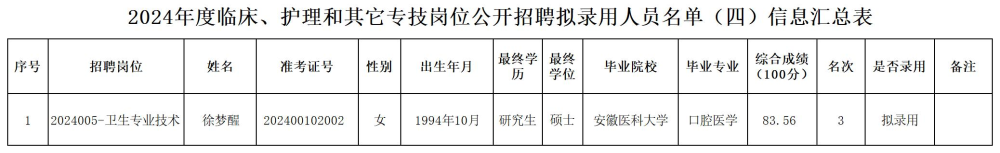 2024年度临床、护理和其它专技岗位公开招聘拟录用人员(四)公示